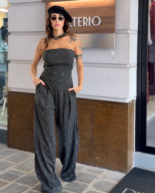 “Jumpsuit elegante in tessuto fluido, con scollo profondo e pantaloni a palazzo. Perfetta per occasioni speciali, unisce eleganza e comfort in un look sofisticato e raffinato.”