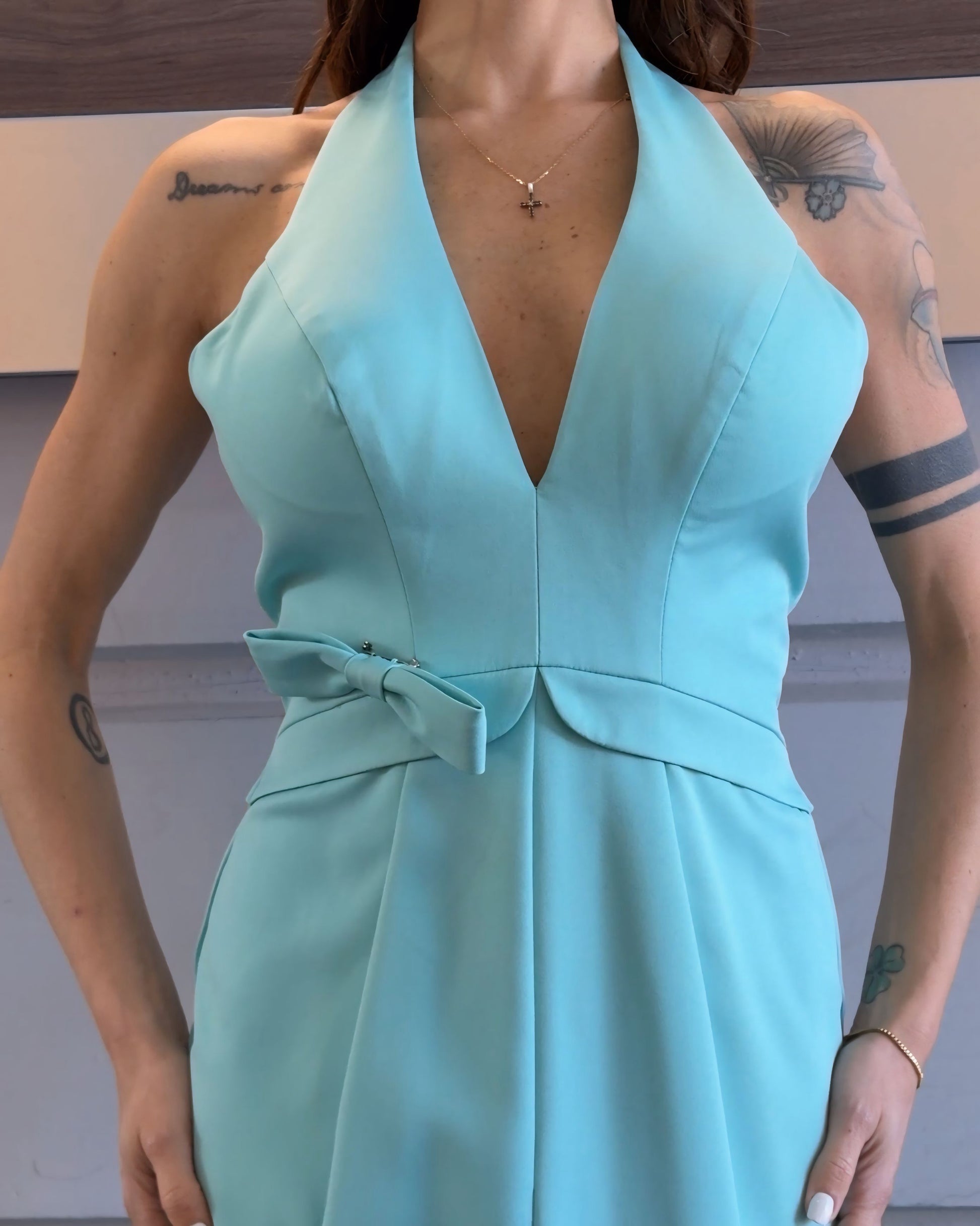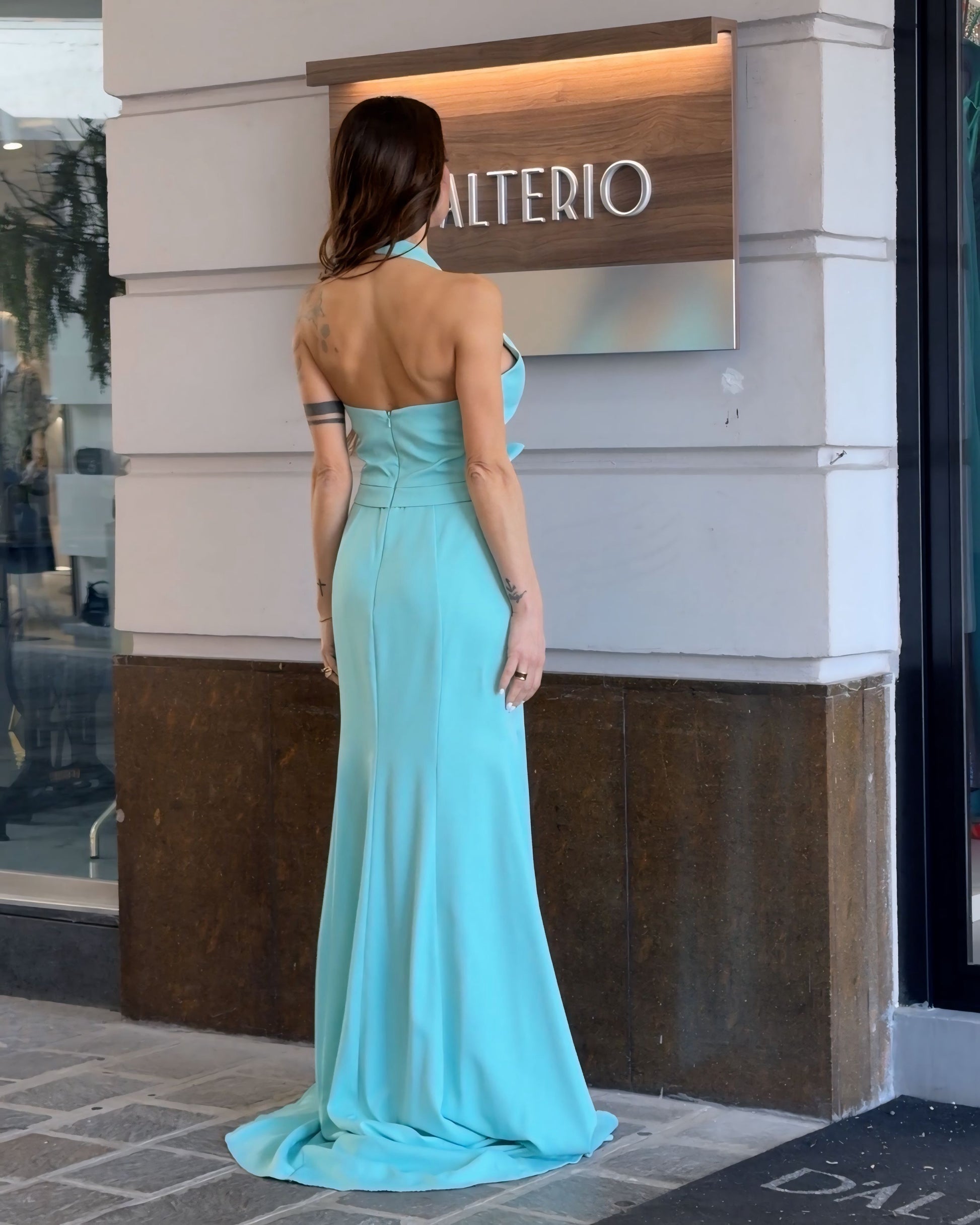 Abito modello sirena in delicato verde acqua, aderente e sinuoso. Lo scollo profondo sulla schiena esalta la femminilità, mentre la coda dona eleganza e movimento. Perfetto per un ingresso scenografico e raffinato.