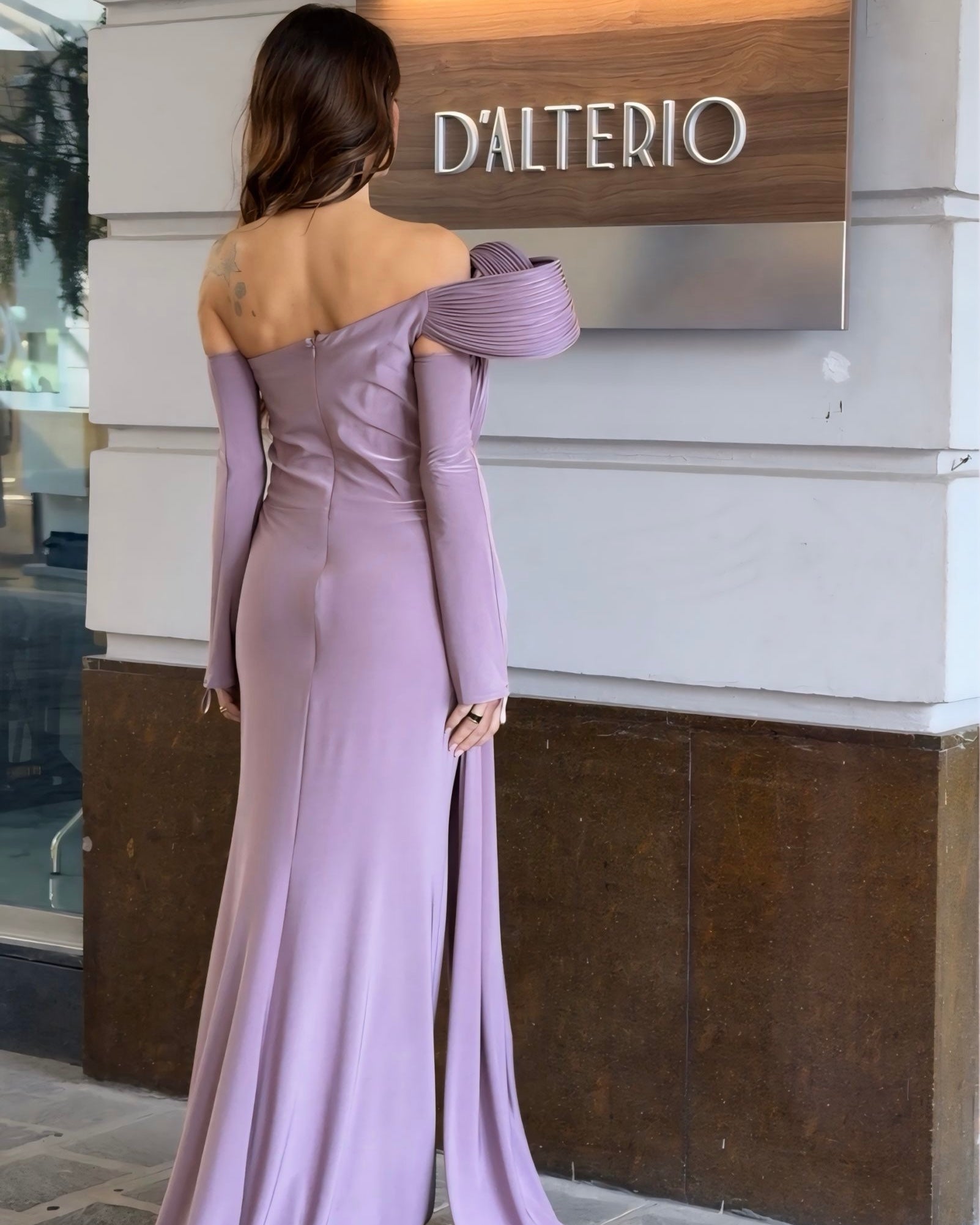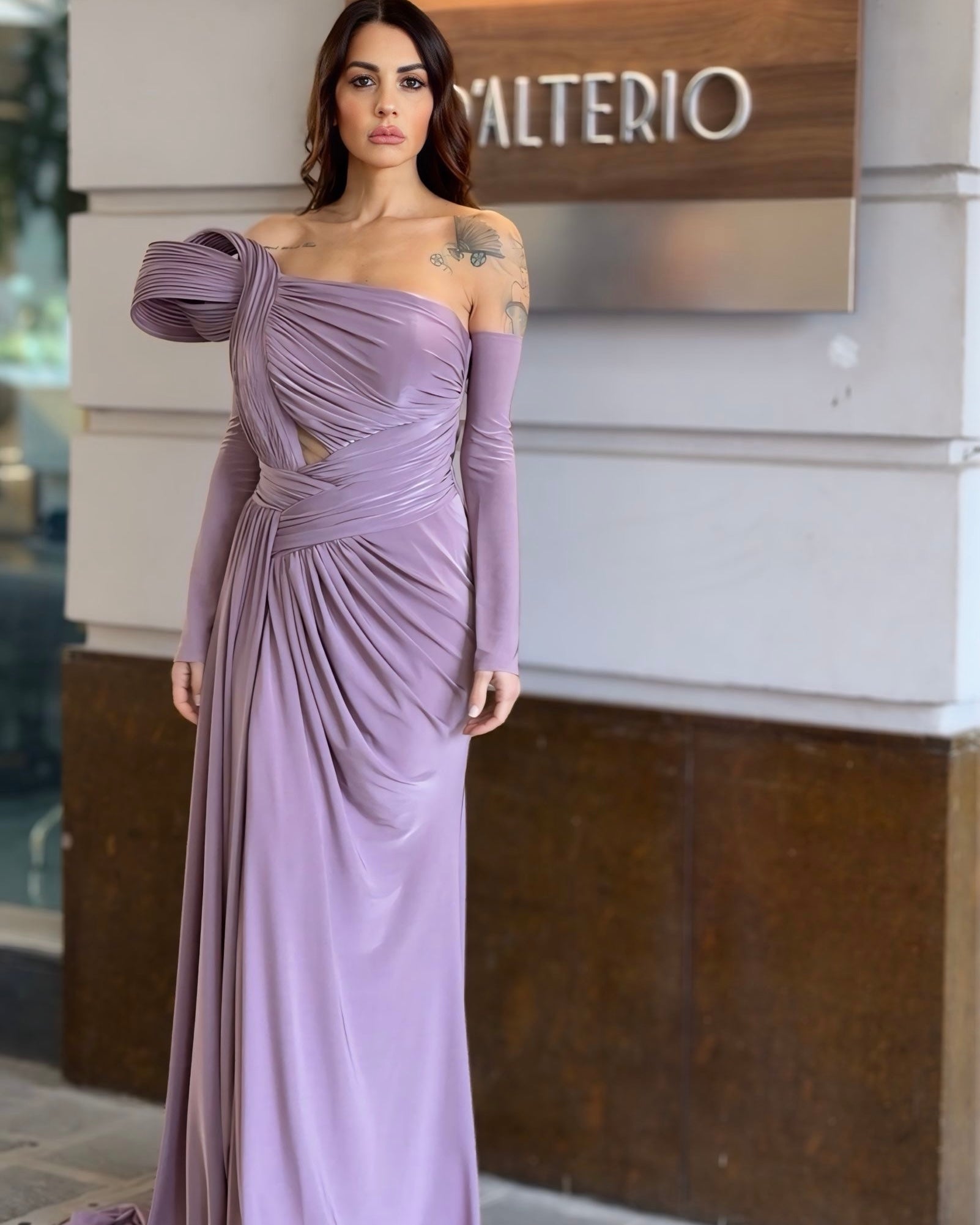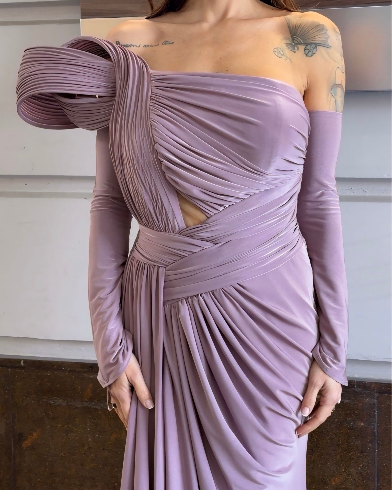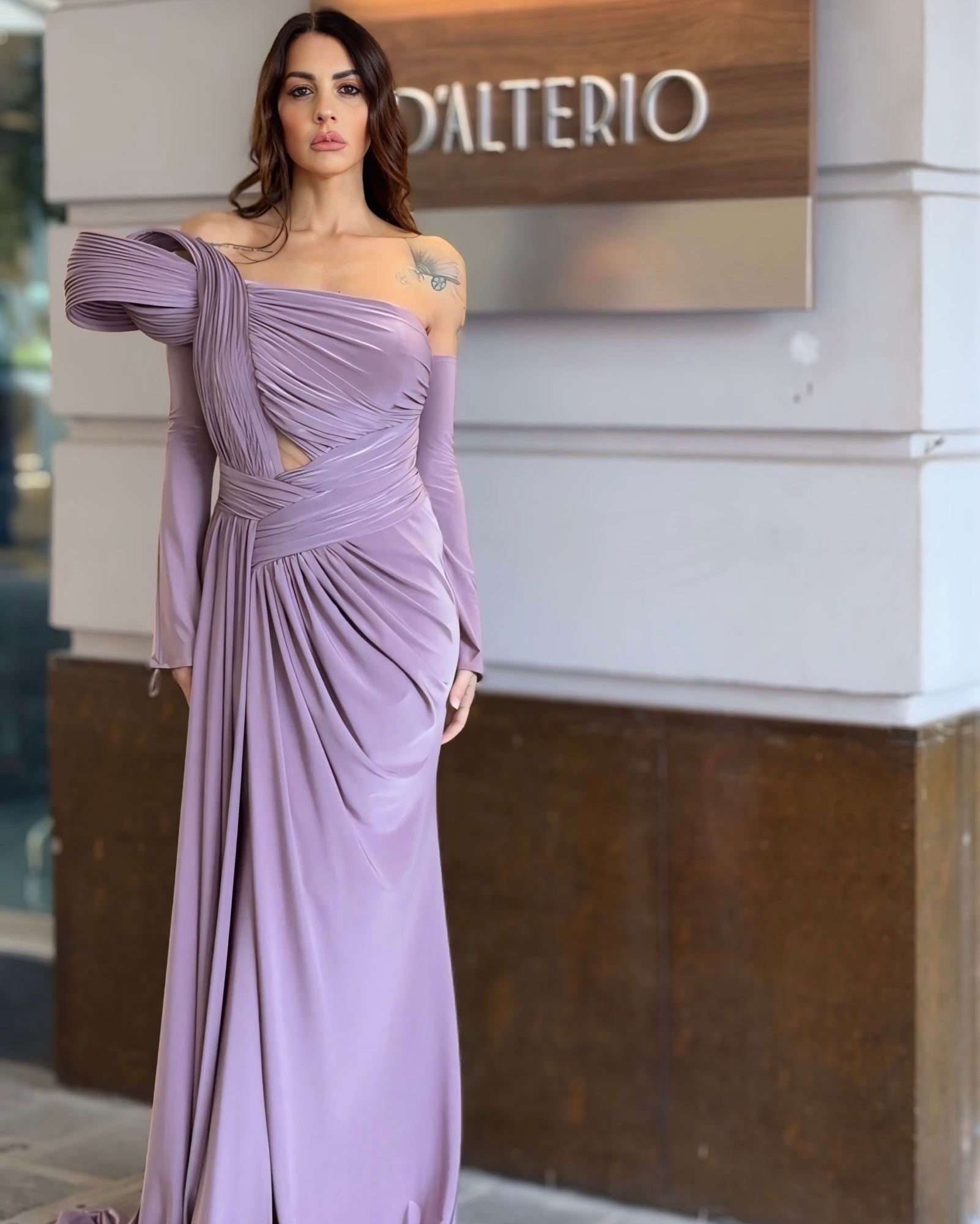 Abito lilla a fascia con coppe imbottite e decoro rigido frontale ad intreccio che valorizza il décolleté. La gonna a sirena presenta drappeggio laterale che accompagna lo spacco, terminando in una coda elegante e fluida. Completo di manicotti coordinati per un look raffinato e di tendenza.