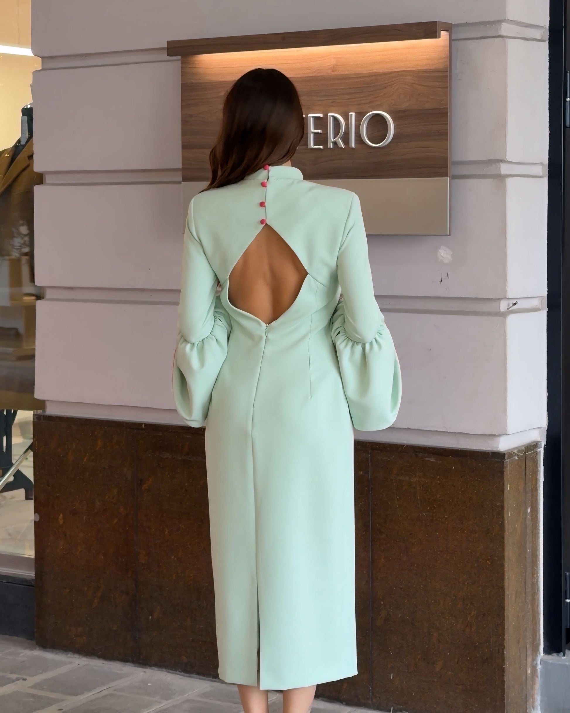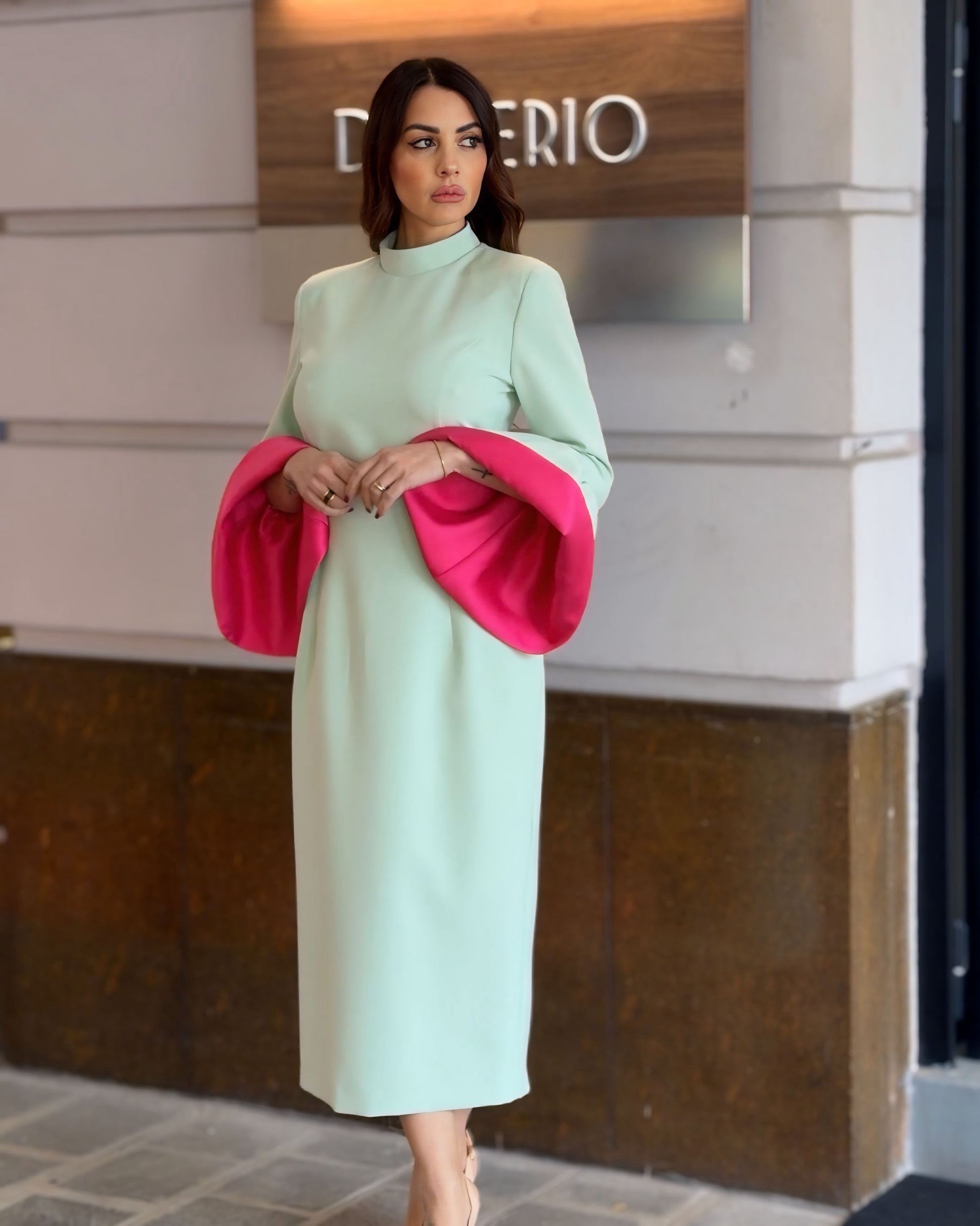Abito midi dal fascino couture, in raffinata tonalità verde menta. Linea essenziale e collo alto per un’eleganza senza tempo, impreziosito da maniche a campana con contrasto fucsia che donano carattere e unicità. Un capo iconico pensato per distinguersi con classe.