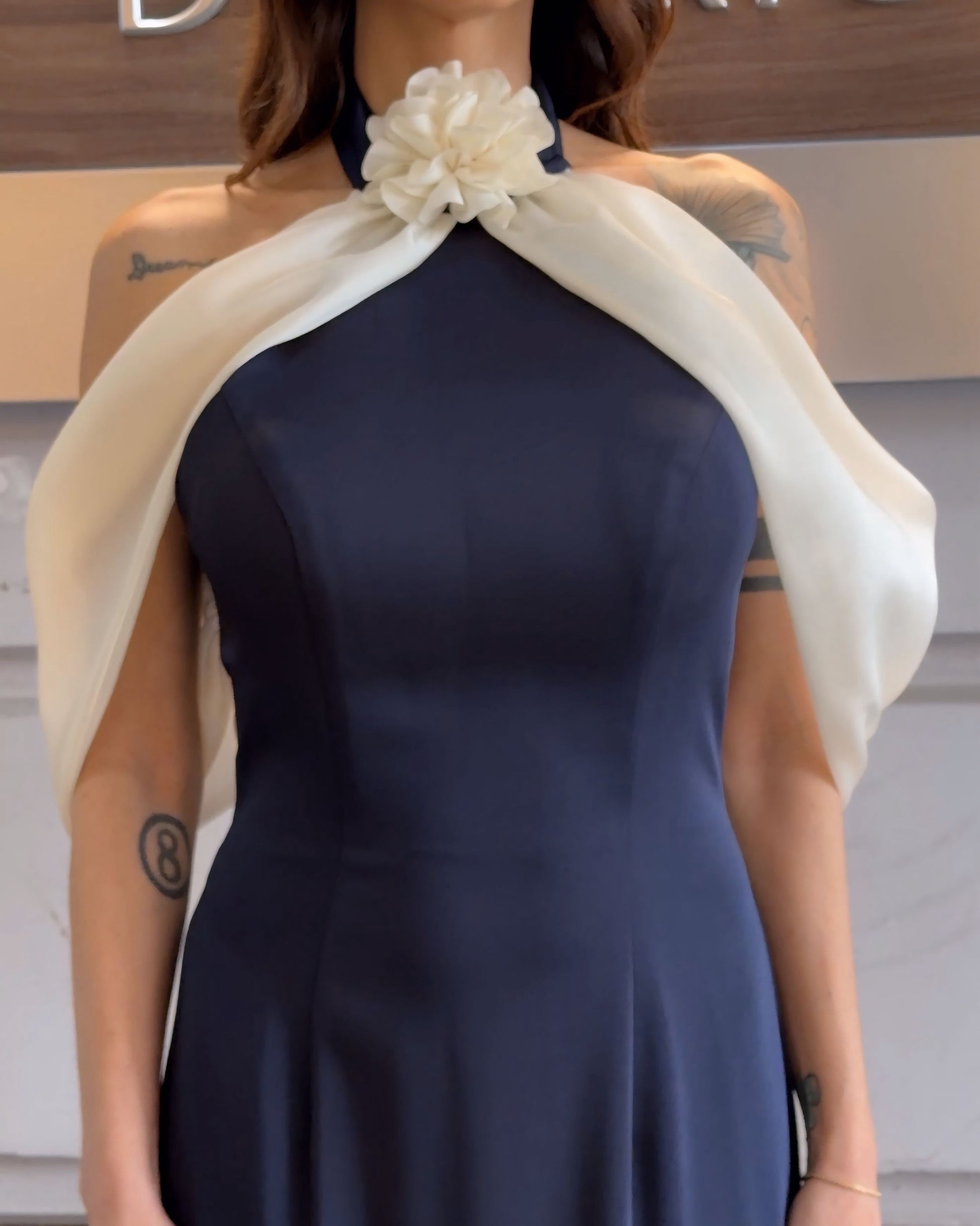 Abito lungo elegante con linea essenziale e raffinata. La banda frontale color panna, impreziosita da rosa centrale, è removibile grazie a pratici bottoncini, permettendo di trasformare il look da sofisticato a minimal con un solo gesto.