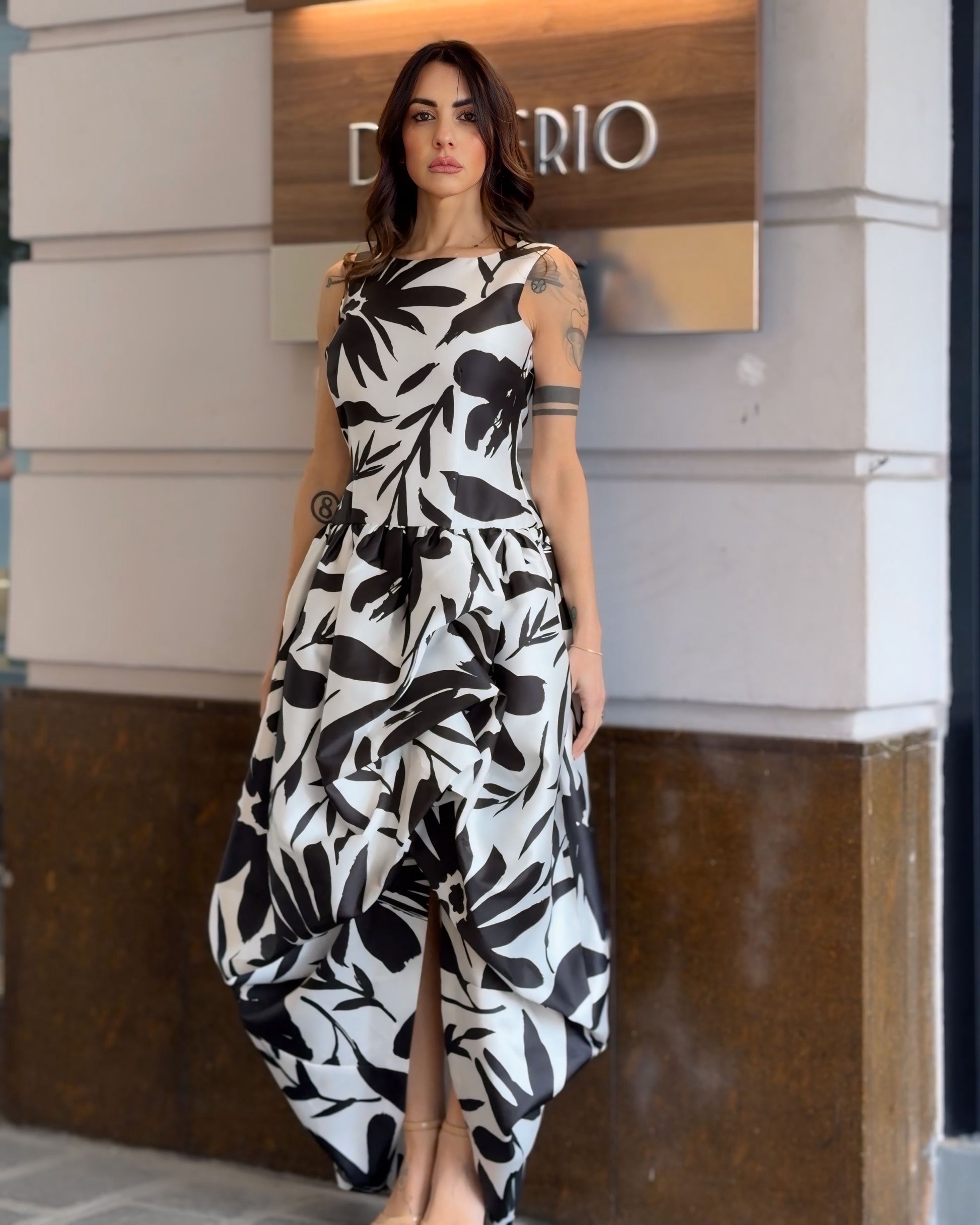 Abito giro manica con parte superiore aderente che valorizza la silhouette, abbinata a una gonna palloncino dal design originale. Sul lato, un raffinato drappeggio crea uno spacco che dona movimento e femminilità. La fantasia a fondo bianco con fiori stilizzati in contrasto nero rende il capo moderno, deciso e di grande impatto visivo.