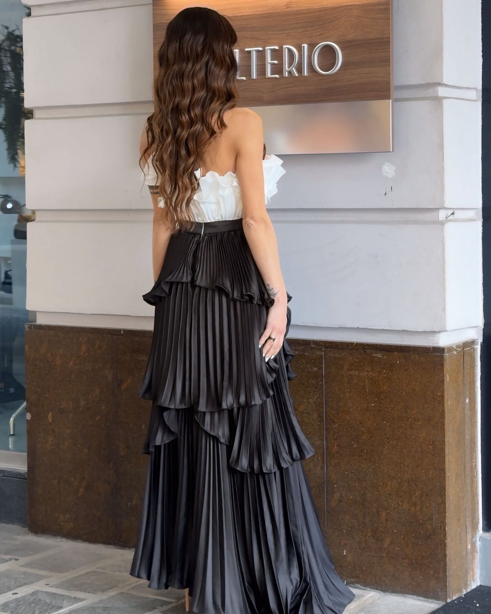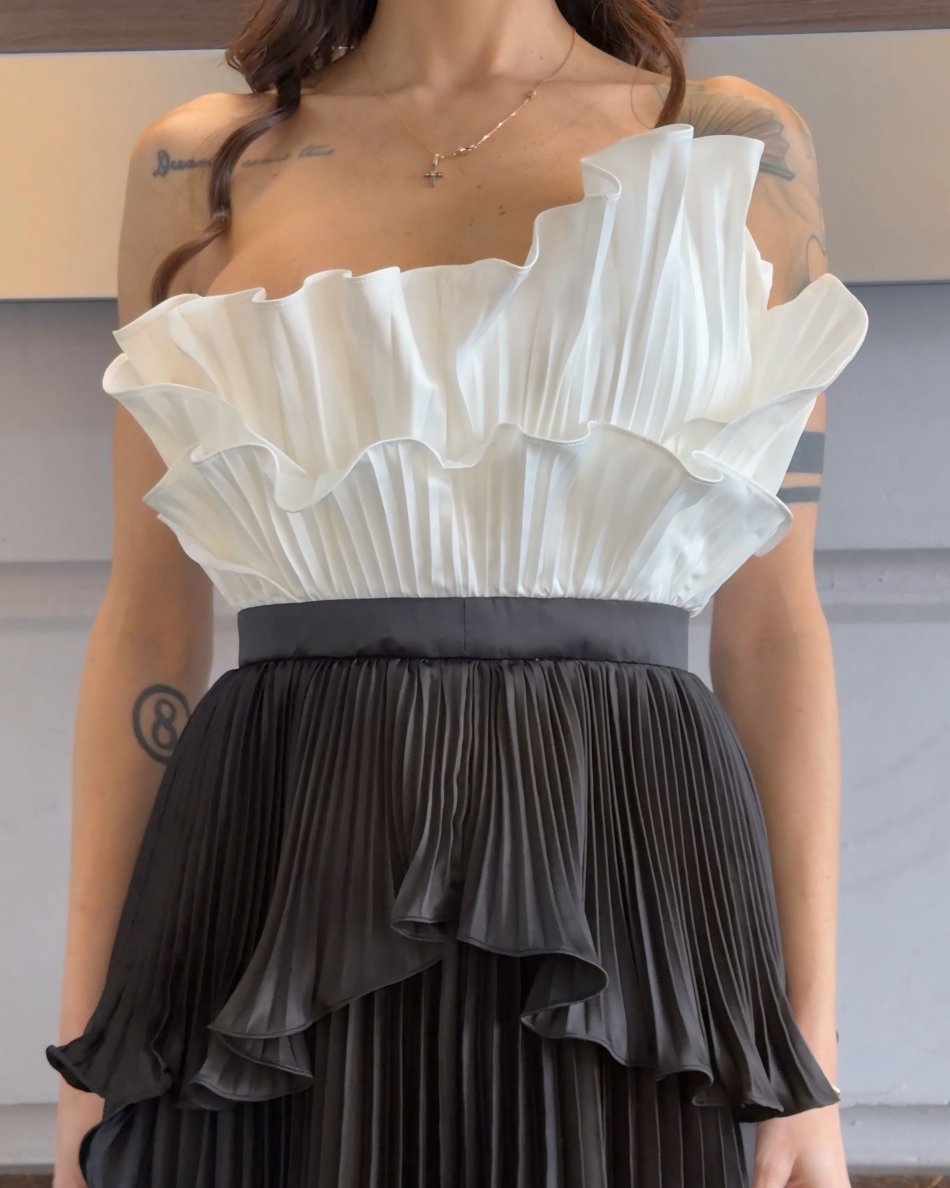 Abito a fascia dal design scenografico, impreziosito da un gioco completo di balze che donano volume e movimento. Il corpetto bianco con coppe imbottite valorizza il décolleté e crea un raffinato contrasto con la gonna nera, intensa ed elegante. Un modello sofisticato e contemporaneo, perfetto per chi desidera distinguersi con classe e personalità. ✨