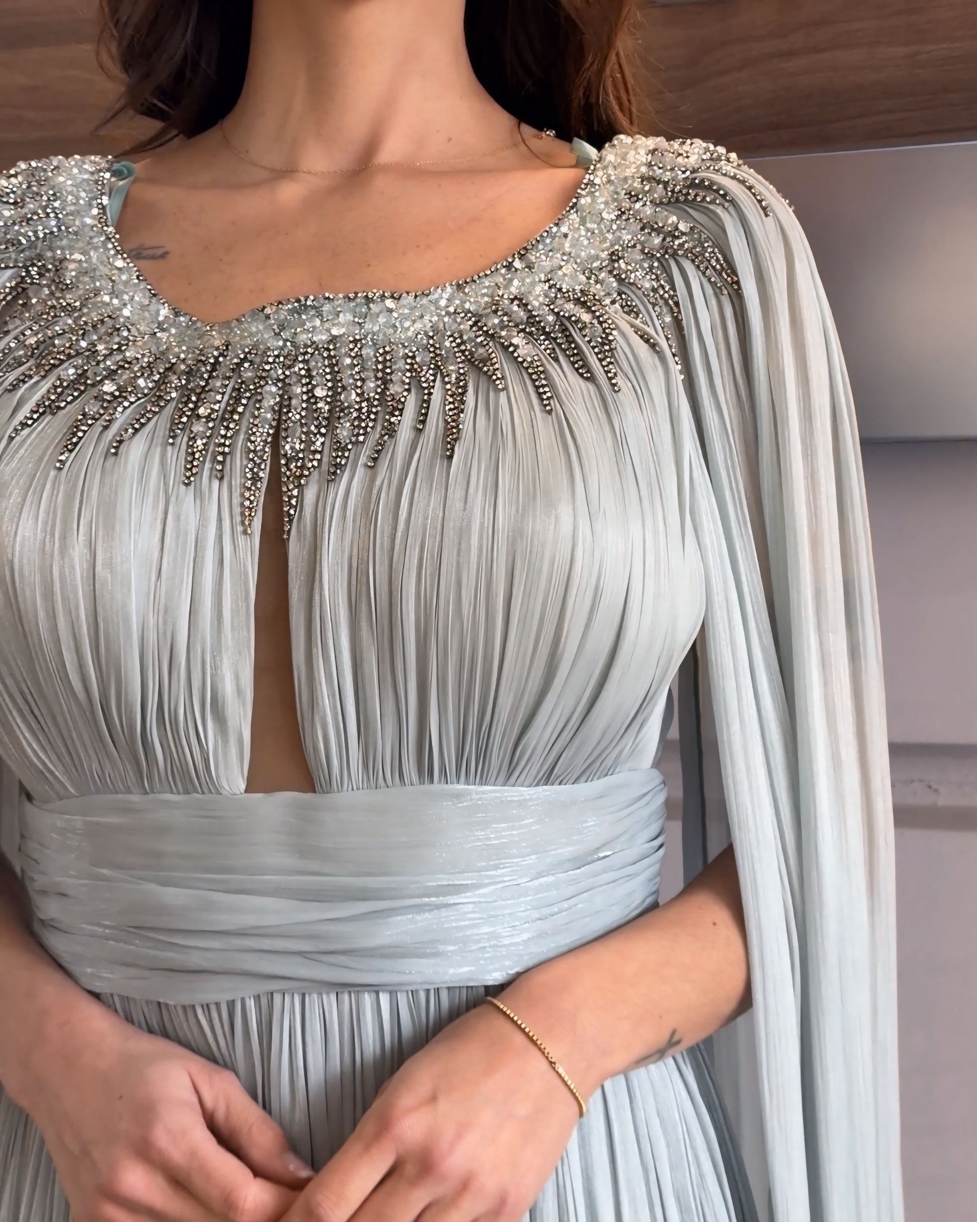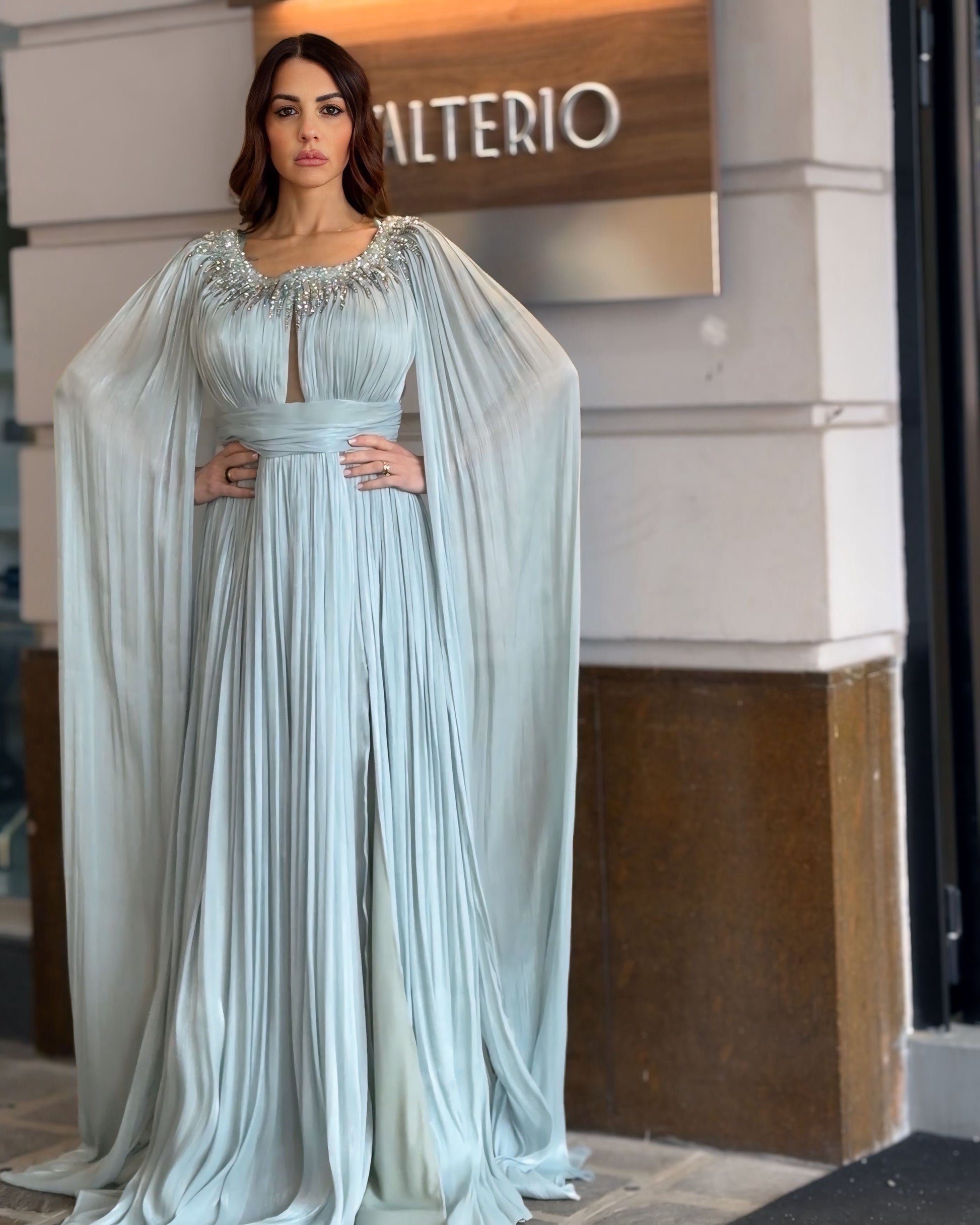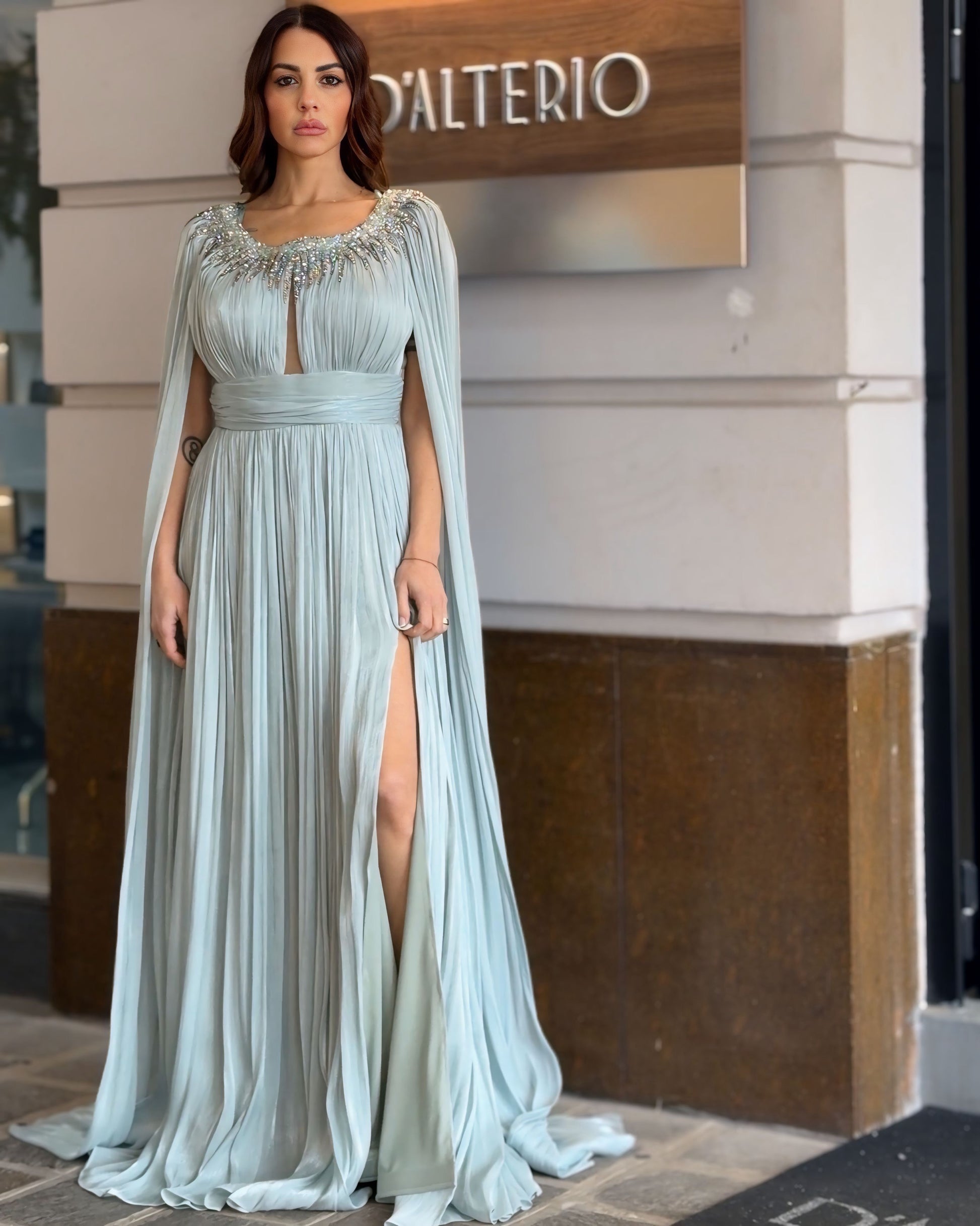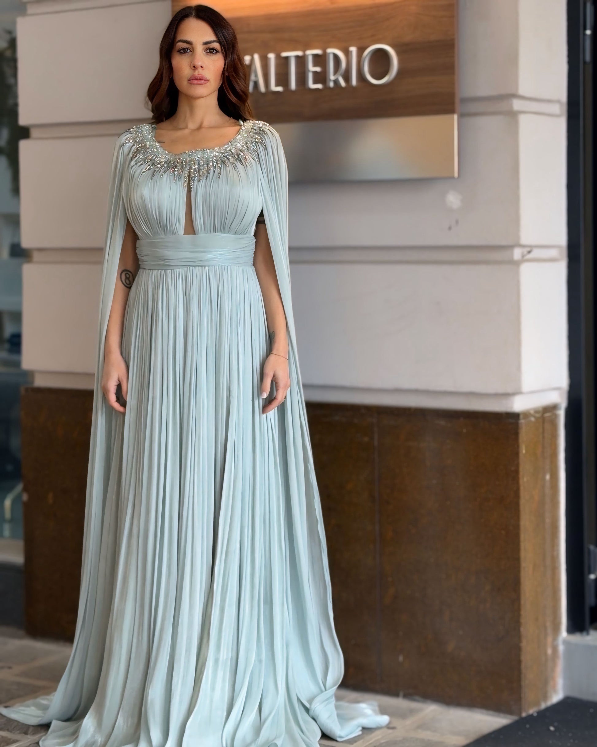 Abito lungo plissé color celeste polvere con scollo gioiello ricamato e mantella fluida sulle spalle. Linea eterea e raffinata, perfetta per cerimonie ed eventi speciali.