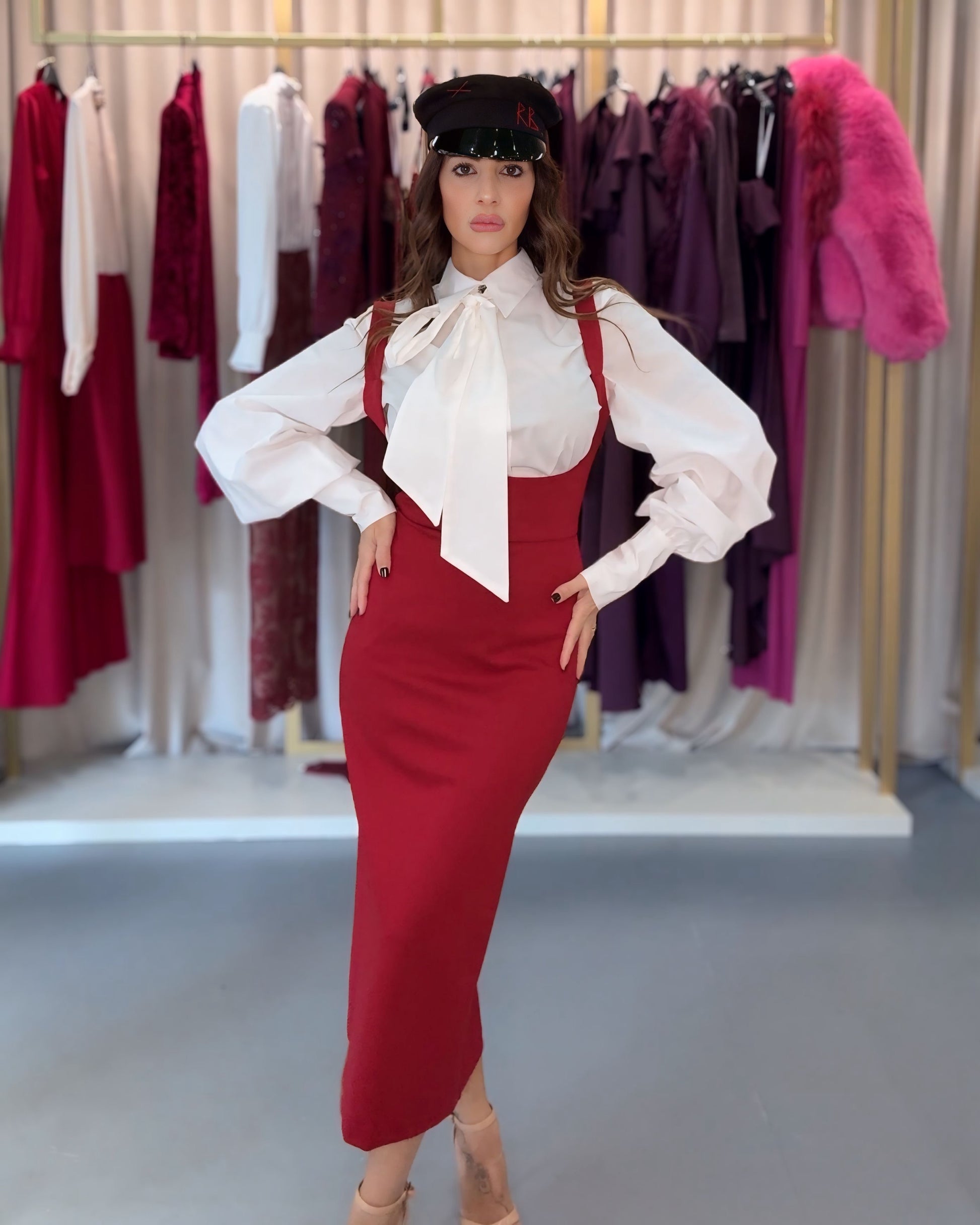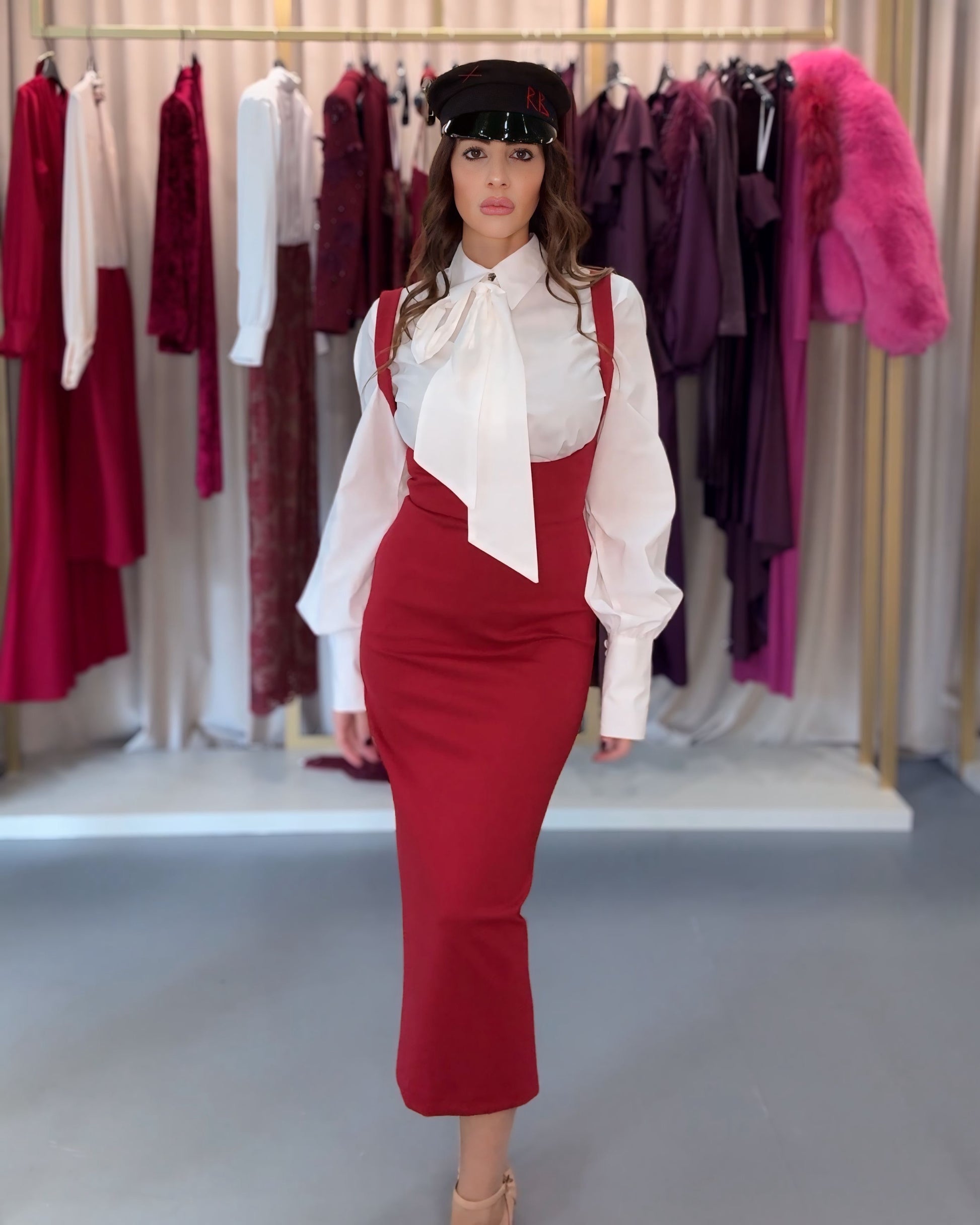 Tubino rosso con bretelle e scollo profondo, impreziosito da uno spacco centrale. Completo di camicia con maniche a palloncino, fiocco laterale e bottone gioiello per un’eleganza sofisticata.