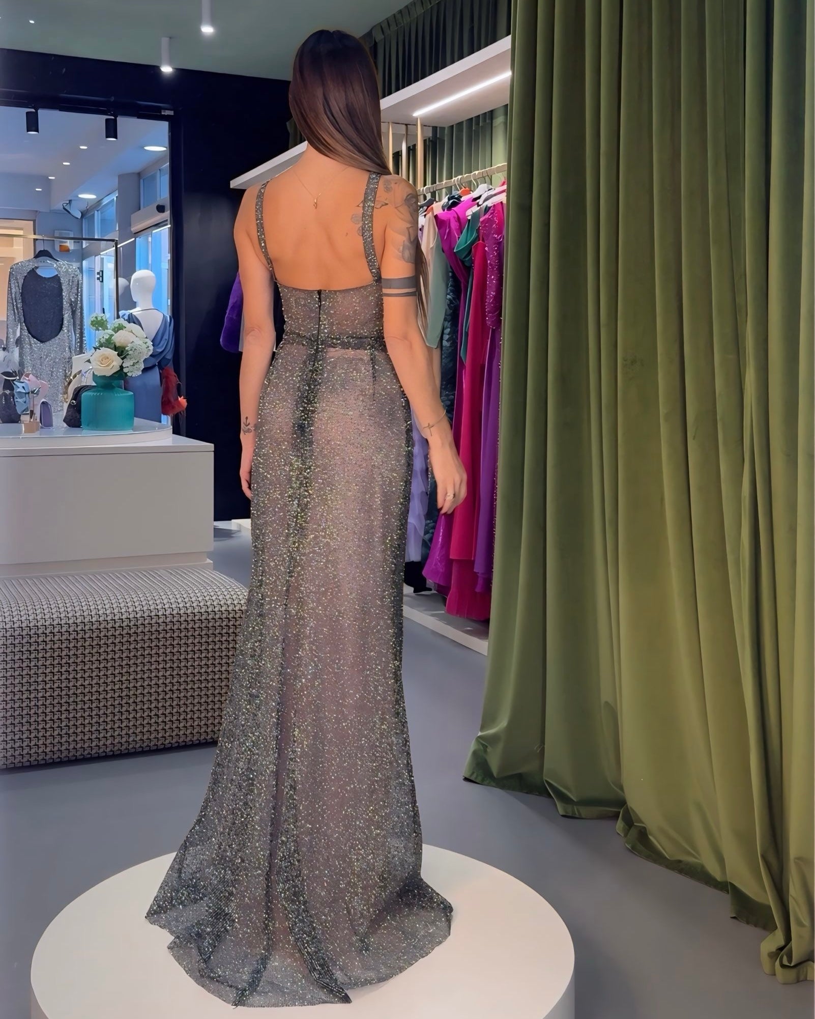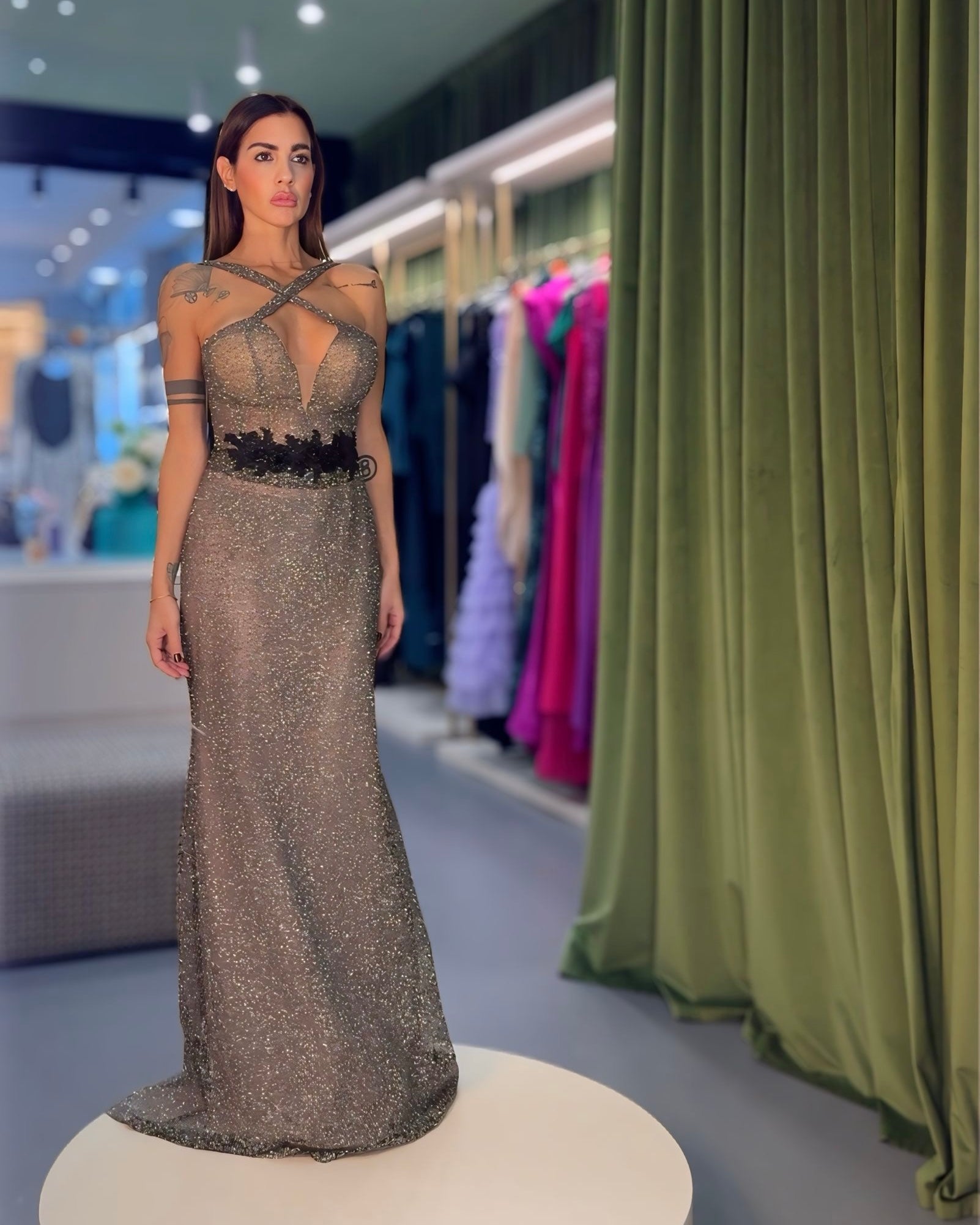 Abito glitterato con coppe imbottite, ricamo frontale nero e coda elegante. Un modello luminoso e raffinato per serate speciali.