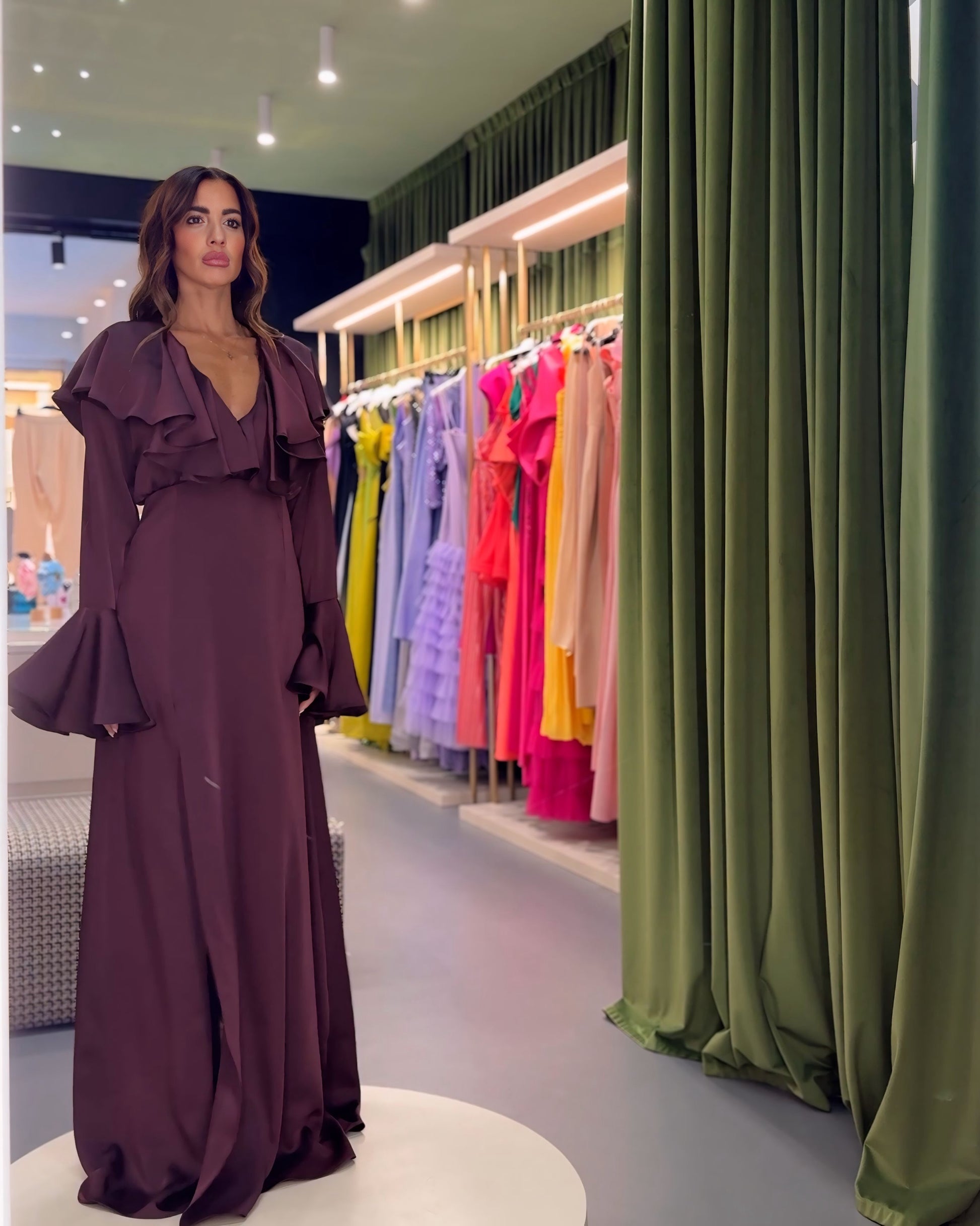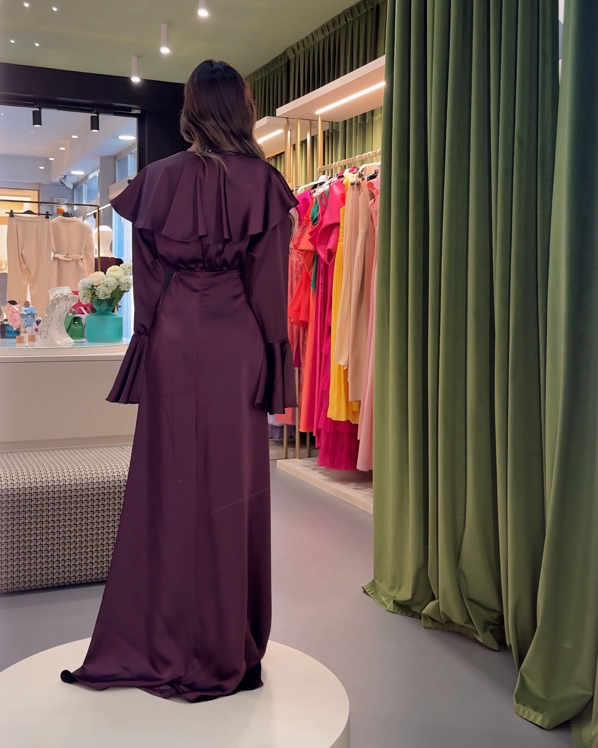 Abito elegante a manica lunga con collo e polsini rifiniti da rouge, spacco laterale e gonna scivolata che valorizza la silhouette.