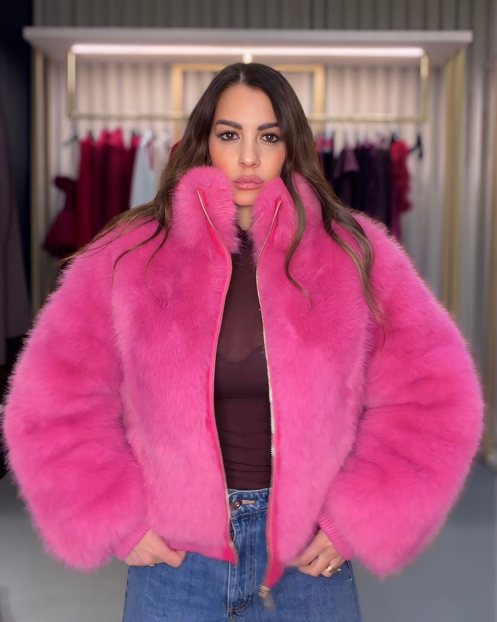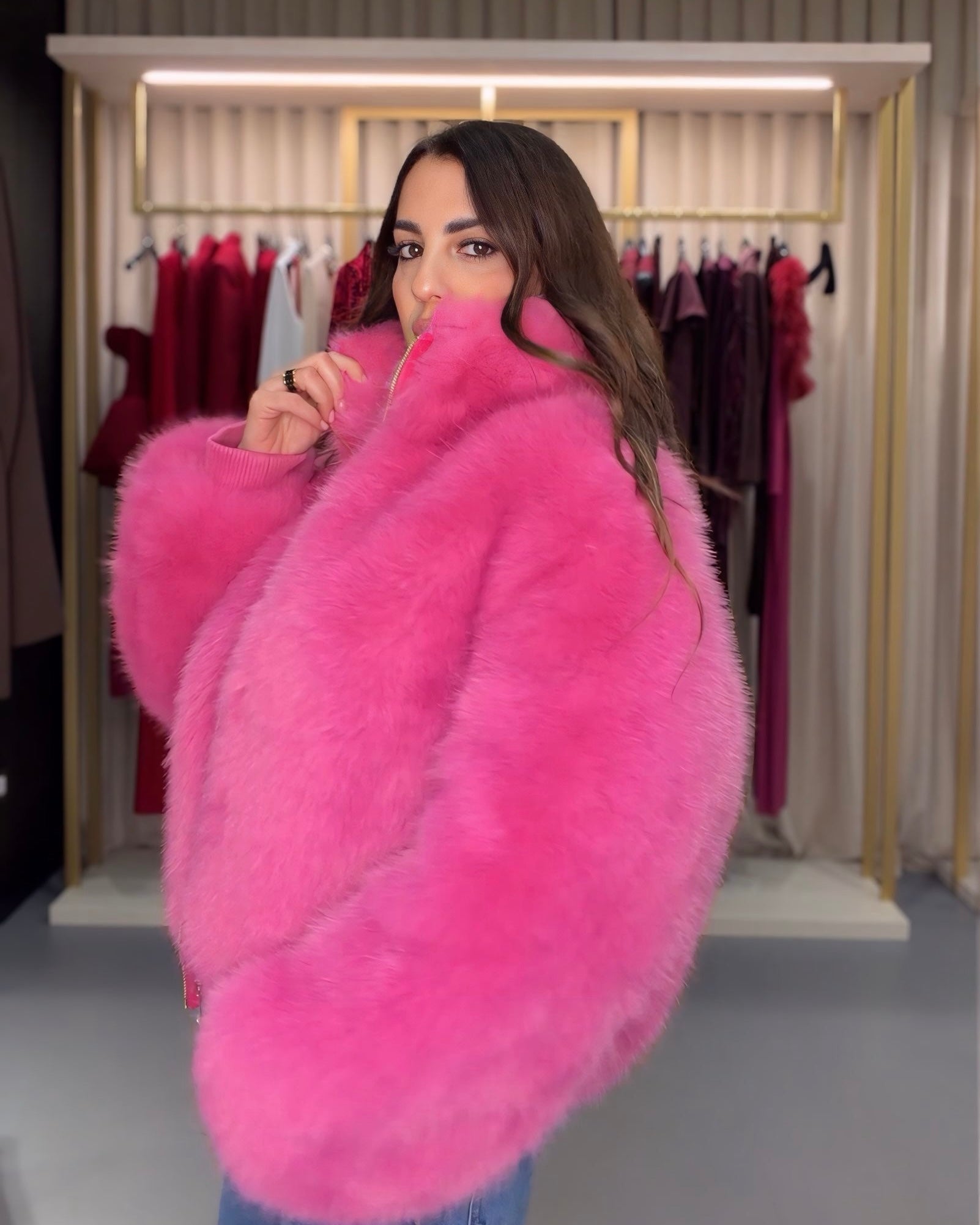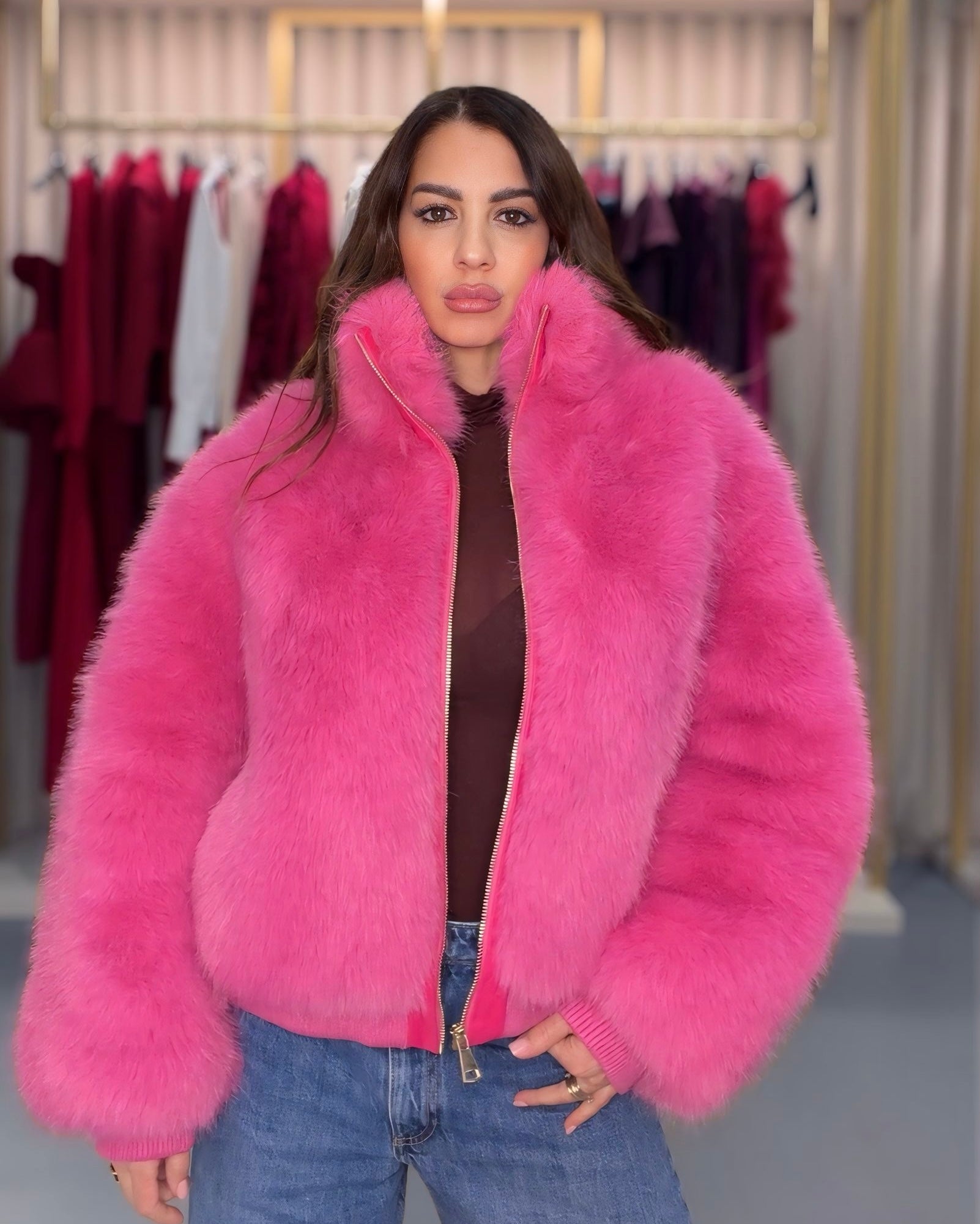 Ecopelliccia in fucsia modello bomber , zip in oro e tasche