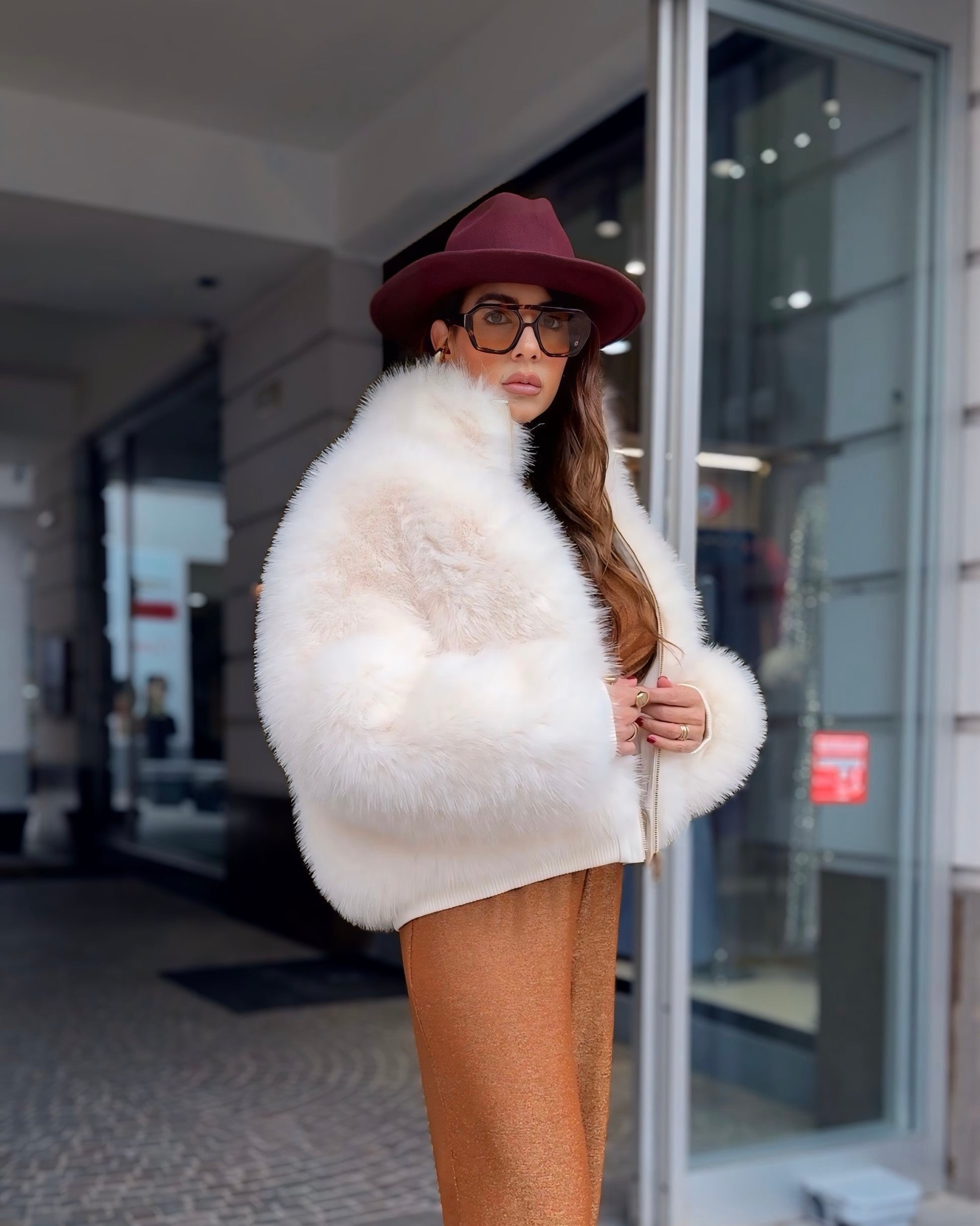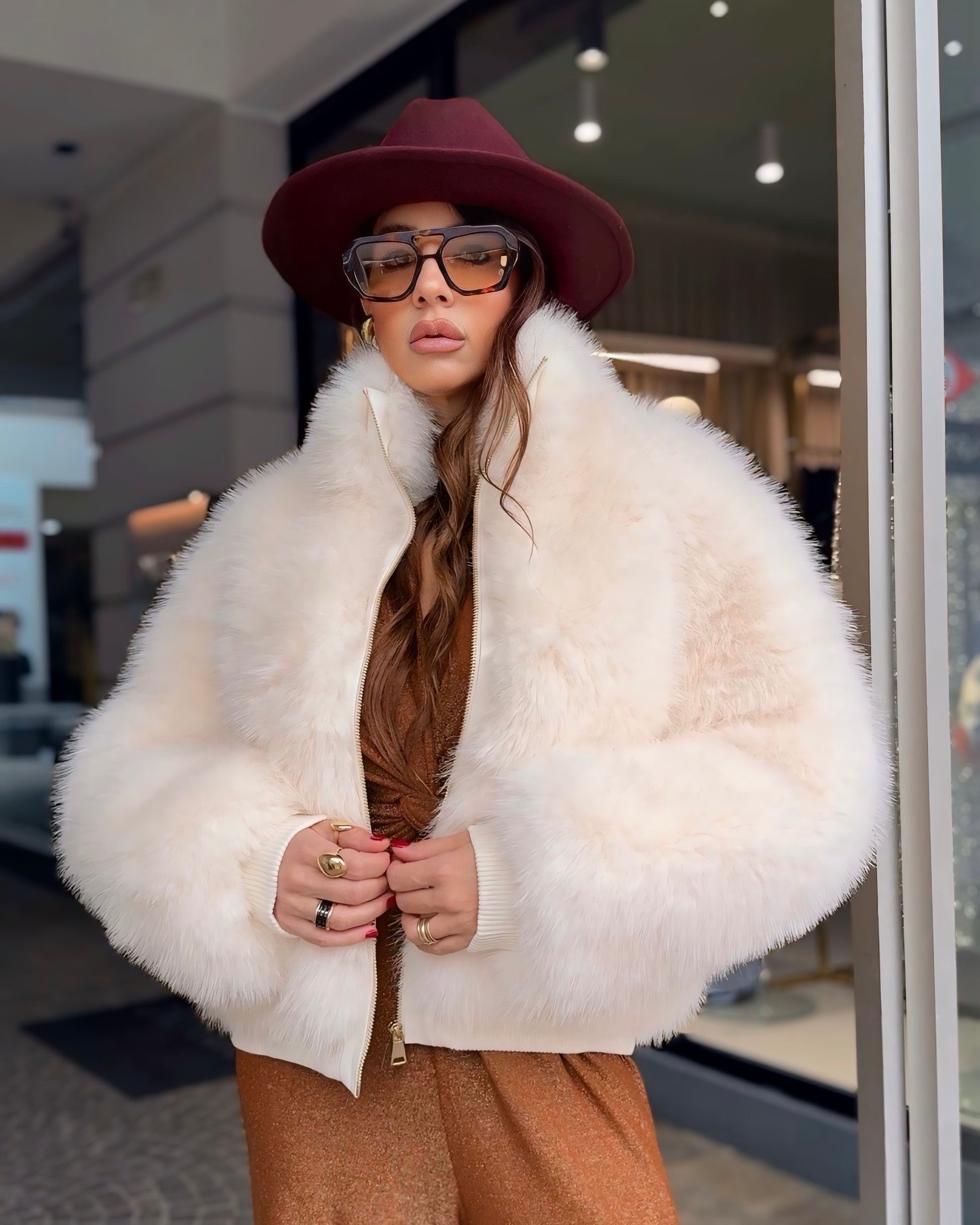 Ecopelliccia bianca dal taglio moderno, impreziosita da una zip oro che aggiunge un tocco di luce e raffinatezza. Calda, morbida e perfetta per look eleganti e urban chic.