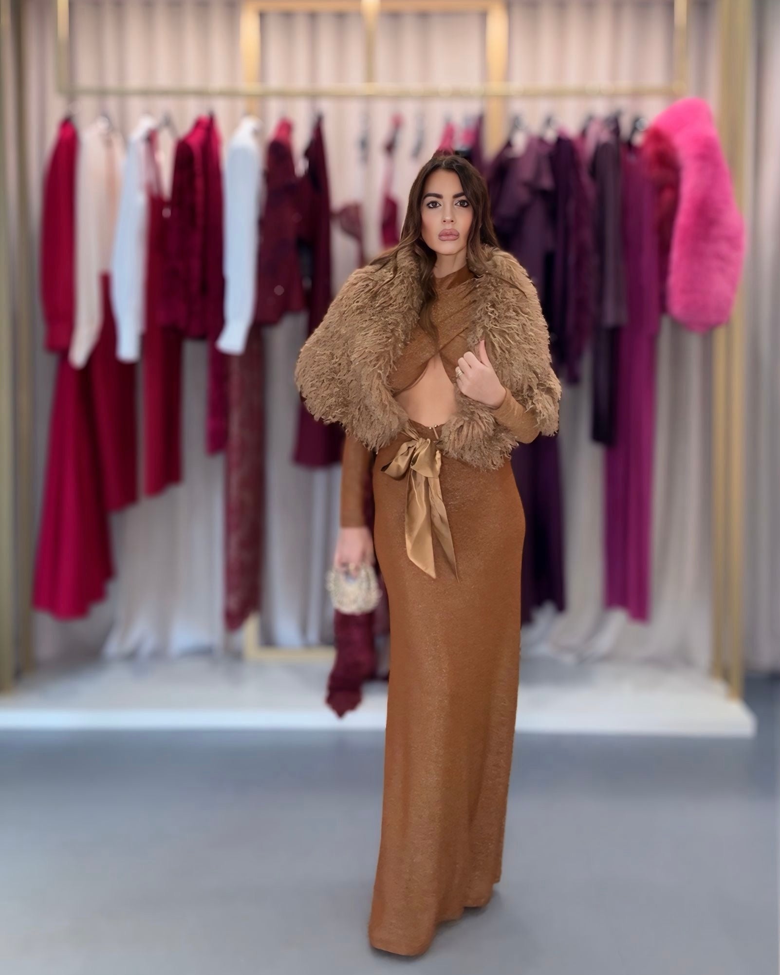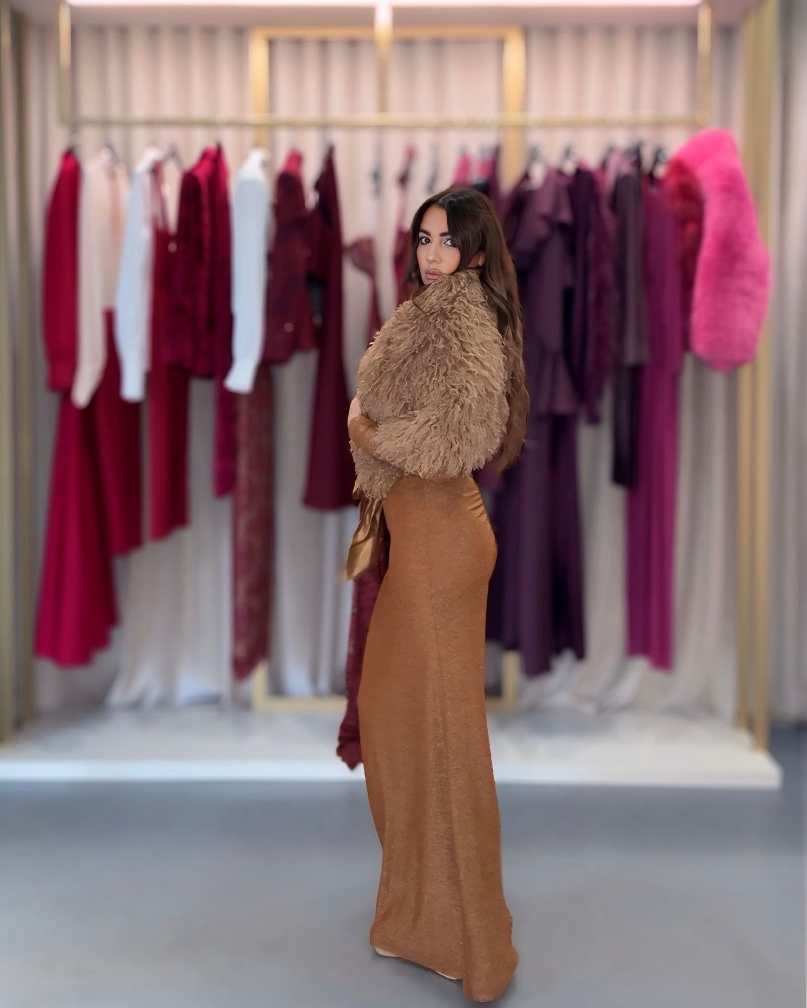 Stola in finta Mongolia color cappuccino, morbida e avvolgente. Si appoggia delicatamente sulle spalle, perfetta da abbinare a capispalla o abiti eleganti per un tocco di raffinatezza.