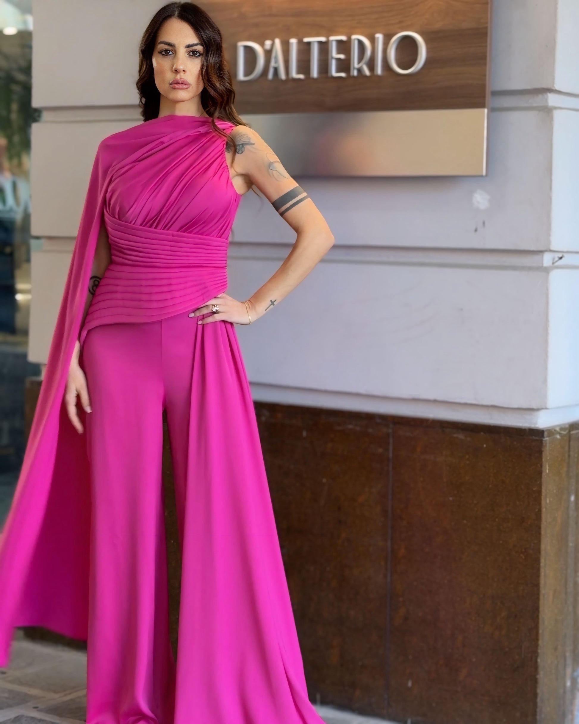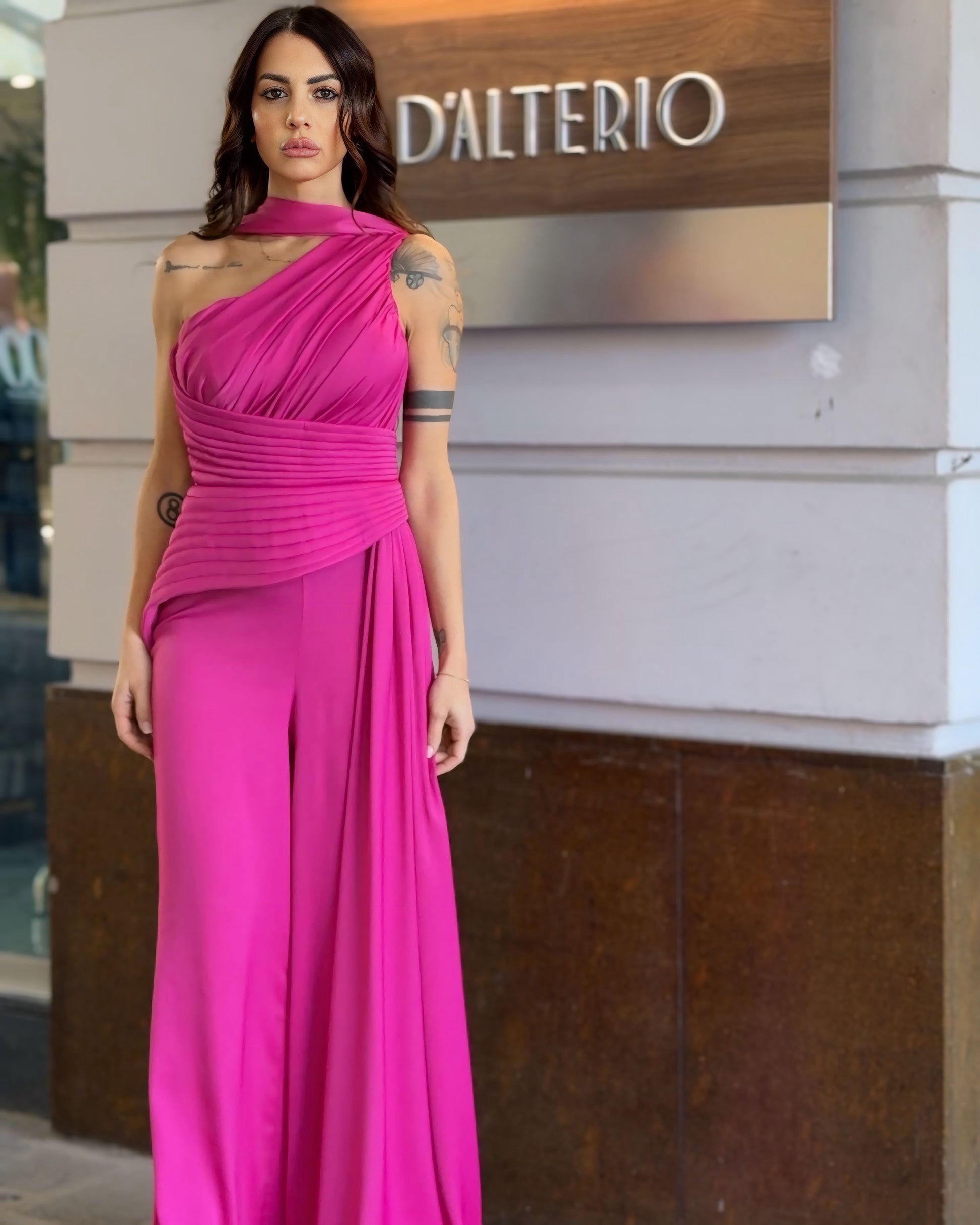Tuta monospalla dal design scultoreo con corpetto a incroci e fasciature frontali che definiscono e snelliscono la silhouette. Coppe imbottite per un sostegno perfetto e pantalone palazzo fluido per un’eleganza moderna e sofisticata.