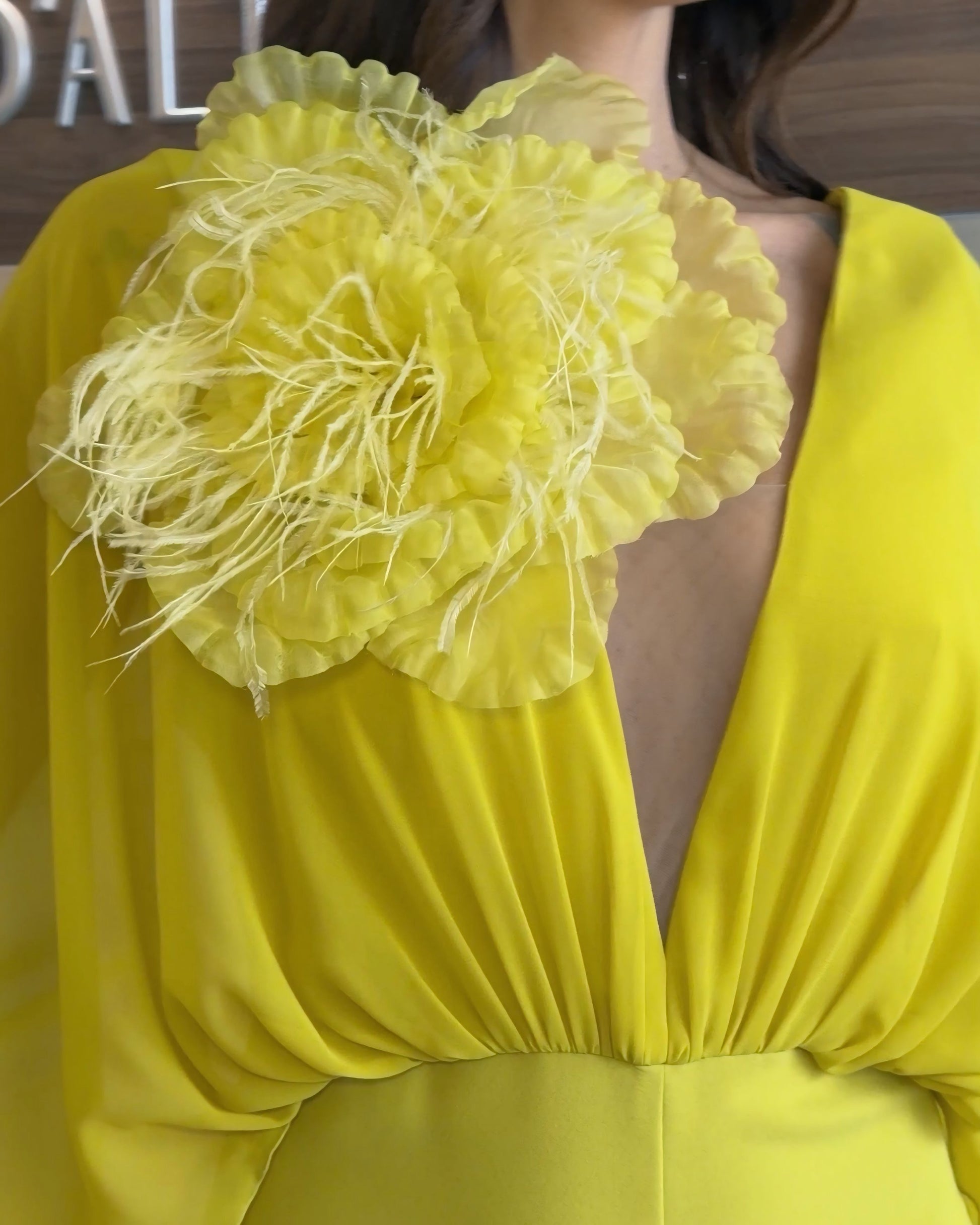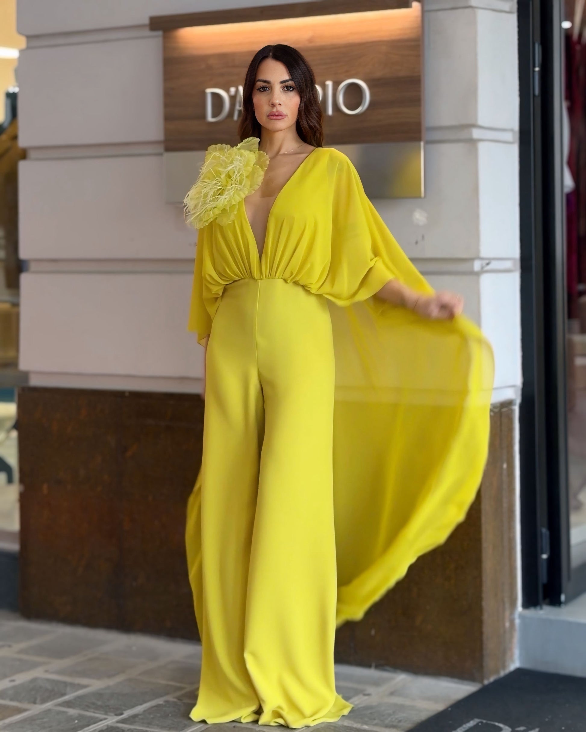 Tuta a palazzo lime con manica a pipistrello, scollatura profonda e coda in georgette, impreziosita da spilla rosone. Un capo scenografico e sofisticato, pensato per farsi notare.