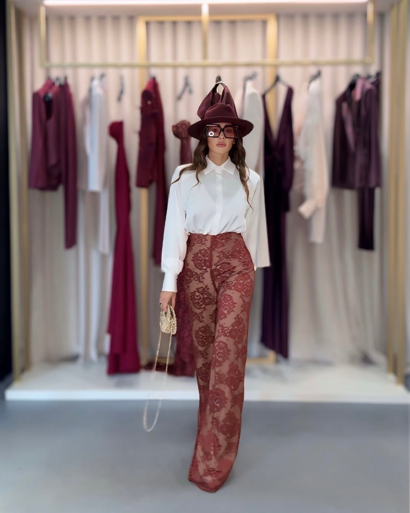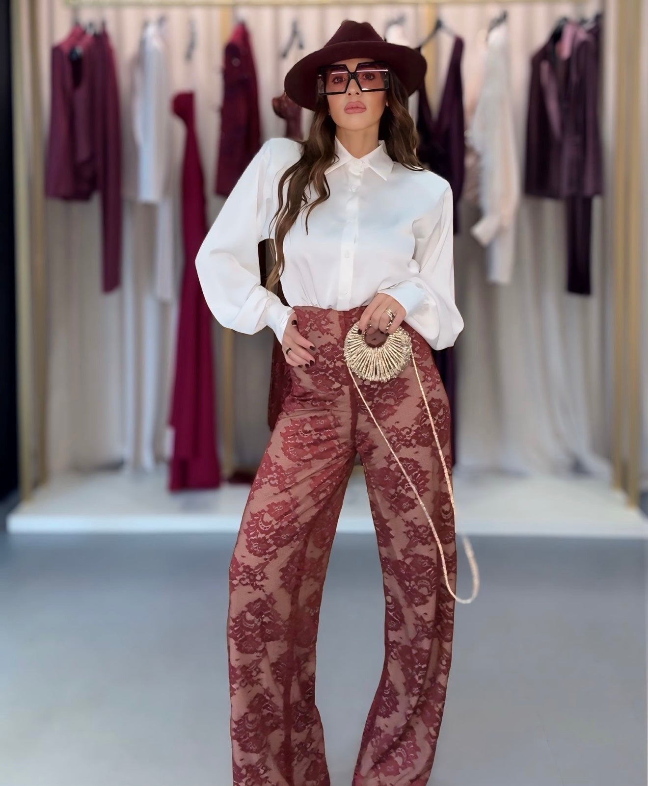 Tuta elegante in pizzo con camicia bianca a manica lunga ampia e spalline strutturate, abbinata a pantalone bordeaux a palazzo a vita alta per un look sofisticato e d’impatto.